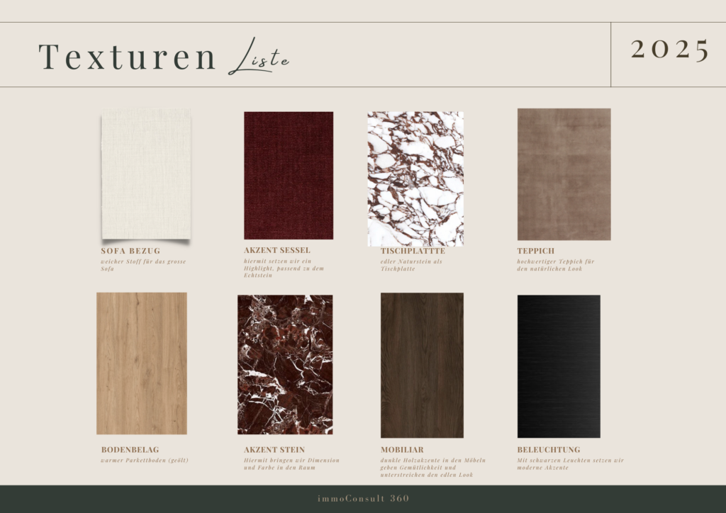 Der Fokus liegt – je nach Bedarf – auf Möbelanordnung/Möbelauswahl, Farb- und Materialkonzept, Grundrissoptimierung sowie einer passenden Shoppingliste zur direkten Umsetzung.